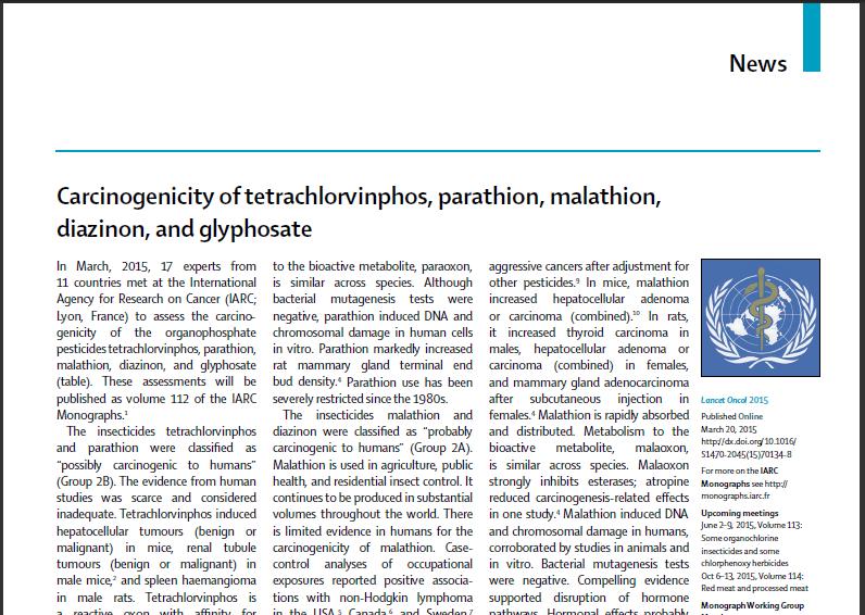 “Estudios de casos y controles por exposición ocupacional en los Estados Unidos, Canadá y Suecia reportan un aumento de los riesgos de linfoma no-Hodgkin, que persistió después de ajustar por exposición a otros pesticidas”, estipula el artículo. Los linfomas no-Hodgkin son una variedad de cánceres que se expanden a partir del tumor de uno o varios linfocitos, que son parte del sistema inmunológico.