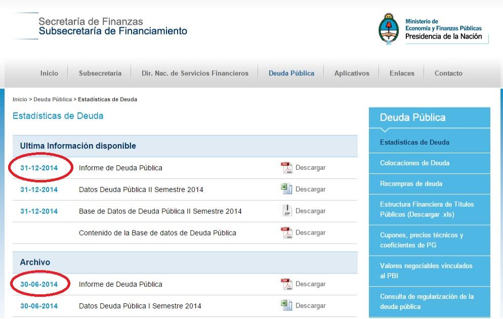 En líneas generales, la Secretaría de Financiamiento venía publicando el informe de la deuda pública cada tres meses. Sin embargo, recientemente se publicaron los resultados computados del 31 de diciembre de 2014, mientras que los anteriores eran del 30 de junio de ese año. Es decir, seis meses de diferencia.