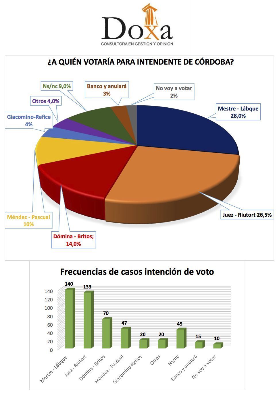 Sobre el cierre de la campaña, cruzada por denuncias de todo tipo, la consultora Doxa dio a conocer una encuesta sobre las intenciones de votos para intendente de Córdoba Capital. Se caracteriza por ser una de las pocas que se conocen hasta ahora, con autores, datos y método. También por ser independiente. Es decir no estar financiada por ningún partido político.