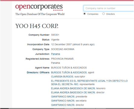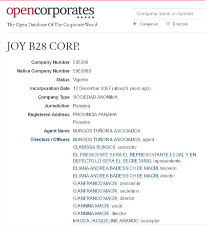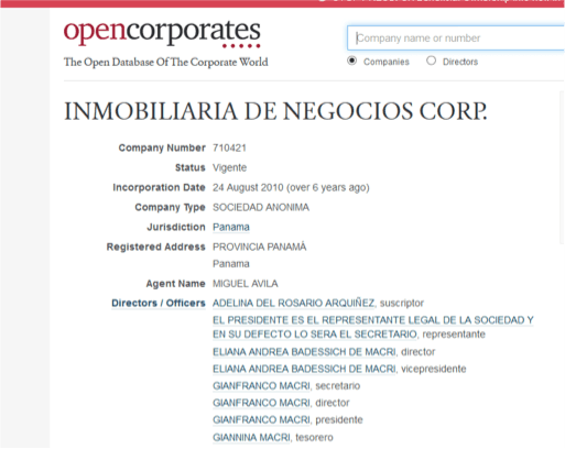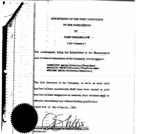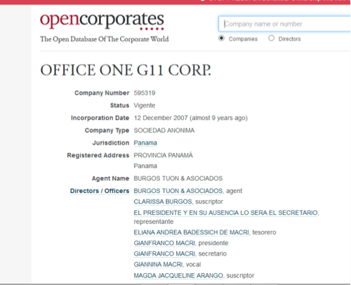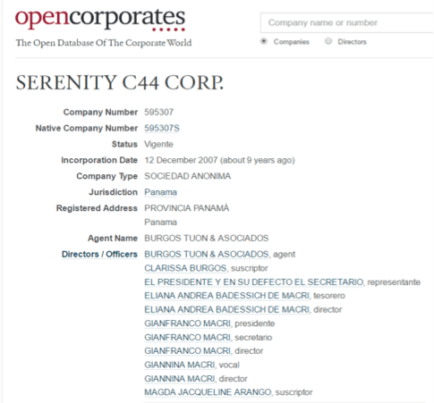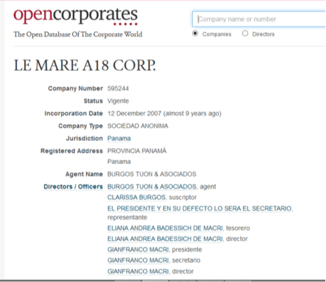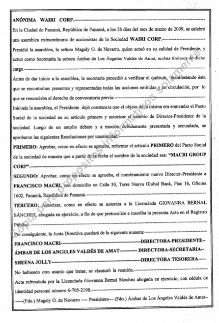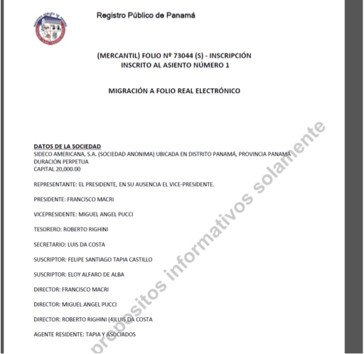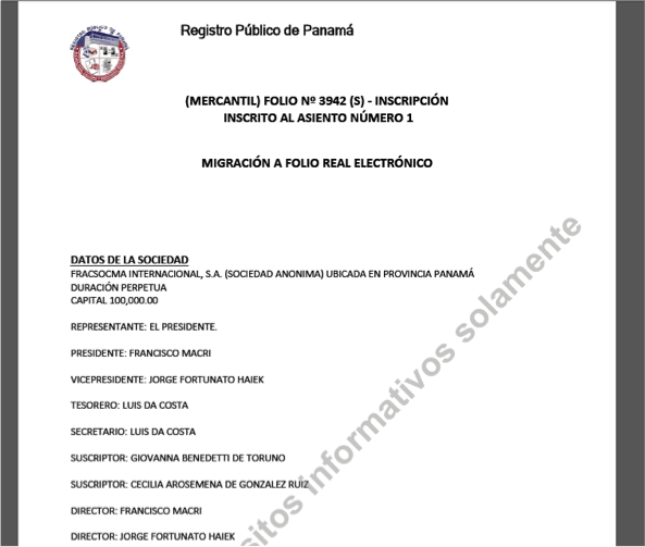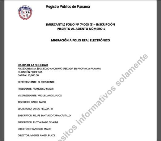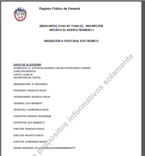 En ella aparece Francisco “Franco” Macri como presidente, Mauricio Macri, su hijo, como vicepresidente, y Mariano Macri, hijo del primero y hermano del segundo como secretario. Según señaló el ICIJ en ese entonces: