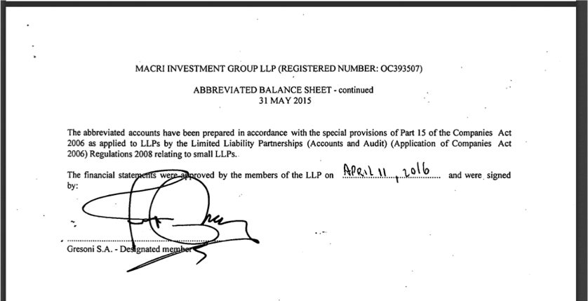 No obstante el documento de abajo, que muestra una fracción del balance general de la empresa inglesa, que incluye el de Gresoni SA, lleva la firma de la propia Florencia Macri, en nombre de esta offshore, con fecha 11 de abril del presente año. O sea que tanto Franco Macri como su hija Florencia, y sus nietos Franco y Rodrigo, lo único que habrían hecho es interponer una pantalla para tratar de disimular que esa offshore británica pertenece al grupo Macri, con vistas a limpiar la foja, o mejor dicho a esta altura el prontuario del Presidente Macri y su familia.