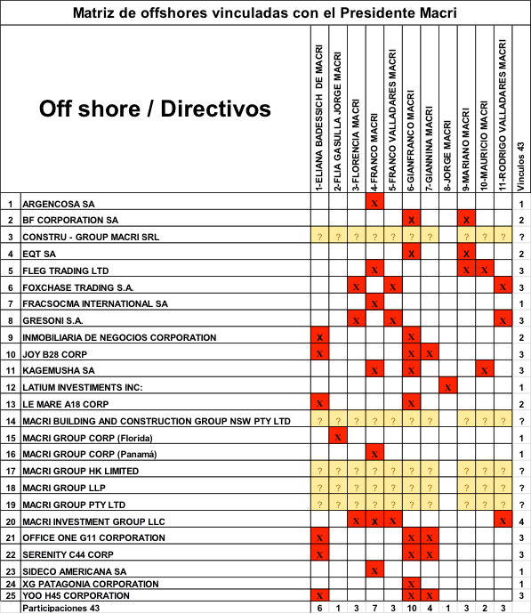 Uno de esos enjambres de offshores está bajo la batuta de Franco Macri, el padre del Presidente. Y el otro de Gianfranco Macri, el hermano del Presidente. Figurando en segundo lugar en el enjambre bajo la batuta de Franco, su hermana Florencia, y sus sobrinos Franco y Rodrigo Valladares Macri. Mientras que en el enjambre a cargo de Gianfranco, figuran subsidiariamente Mariano Macri, el hermano del Presidente; la cuñada del Presidente casada con Gianfranco, Eliana Badessich, y Gianina Macri, la sobrina del Presidente hija de Gianfranco y Eliana. Subsidiariamente también aparece hasta ahora como desconectado a esos enjambres, Jorge Macri, el primo del Presidente.