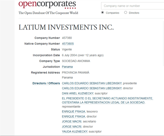 En julio de 2004, meses antes de que Mauricio Macri asumiera su primer cargo público como diputado nacional, su primo Jorge Macri había creado la empresa panameña LATIUM INVESTMENTS INC. La empresa todavía está activa.