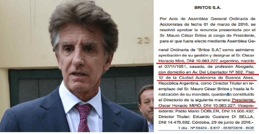 Oscar Horacio Miro, ex funcionario del gobernador José Manuel De la Sota, consuegro del general Cesar Milani, es actualmente un conocido empresario porteño. Entre otras firmas es presidente de la constructora Britos S.A., que durante los últimos años bajo el gobierno de De la Sota y Juan Schiaretti, resultó adjudicataria de millonarios contratos de obras públicas a lo largo y lo ancho de la provincia de Córdoba.