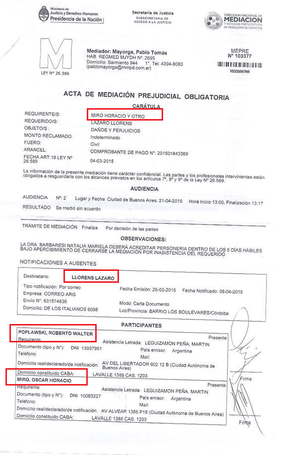 Luego de algunas cartas documentos, estas acciones terminaron en una audiencia de conciliación, en la Ciudad Autónoma de Buenos Aires, a la que acudieron en persona Miró y su socio Poplawski. A ella, el periodista Llorens no asistió. Mandó en representación un apoderado que ratificó absolutamente todo lo publicado. Como respuesta, y en tono prepotente, ellos dijeron que iban a demostrar judicialmente la real malicia del periodista, cosa que nunca se atrevieron a hacer.