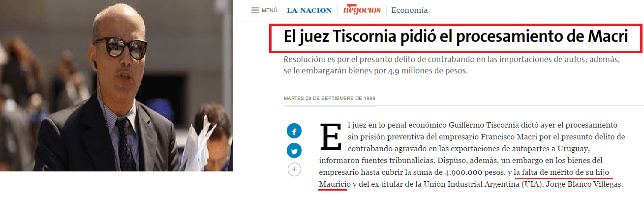 Con todas estas vueltas, la definiciones por la causa de los Macri se dilataron hasta 1999, cuando el Juez Guillermo Tiscornia del Juzgado Federal N°7, también luego destituido por mal desempeño, decidió procesar por contrabando a Franco Macri, sin prisión efectiva, fijando un embargo de 4,9 millones de pesos. Dictando a la par el sobreseimiento de su hijo Mauricio, por entonces presidente del club Boca Juniors, y su cuñado Blanco Villegas.Esta otra causa se había iniciado en los Tribunales Federales de Córdoba, a raíz de otra denuncia por contrabando, similar a la de SEVEL, que involucró a la firma CIADEA – Renault. La había iniciado el polémico juez federal Ricardo Bustos Fierro, quien la derivó al juzgado de Marquevich, y de allí recaló en lo de Tiscornia.