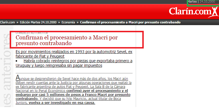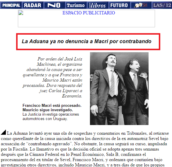 Todo esto acontecía mientras Mauricio Macri, con el cuerpo del expediente por contrabando aún caliente en el ropero, hacía su debut en la política y competía por primera vez por la Jefatura de Gobierno porteño, frente al candidato kirchnerista Aníbal Ibarra.