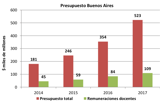 En el mismo se aprecia que las previsiones para las remuneraciones docentes se han rezagado a lo largo de los cuatro últimos años, si se las compara con el total de gastos provincial, que pasó de 181 mil millones a 523 mil millones desde el 2014 al 2017, o sea que tuvo un incremento del 190 %.