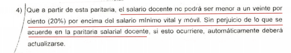 Esta afirmación es una falsedad, que ha exasperado aún más el conflicto, y determinado a los líderes de los gremios docentes a proseguir con el paro. Ya que la cláusula argüida por Bullrich, en realidad solo dice que “el salario docente no podrá ser menor a 20 % por encima del salario mínimo vital y móvil. Sin perjuicio de lo que se acuerde en la paritaria salarial docente, si esto ocurriere, automáticamente deberá actualizarse”.