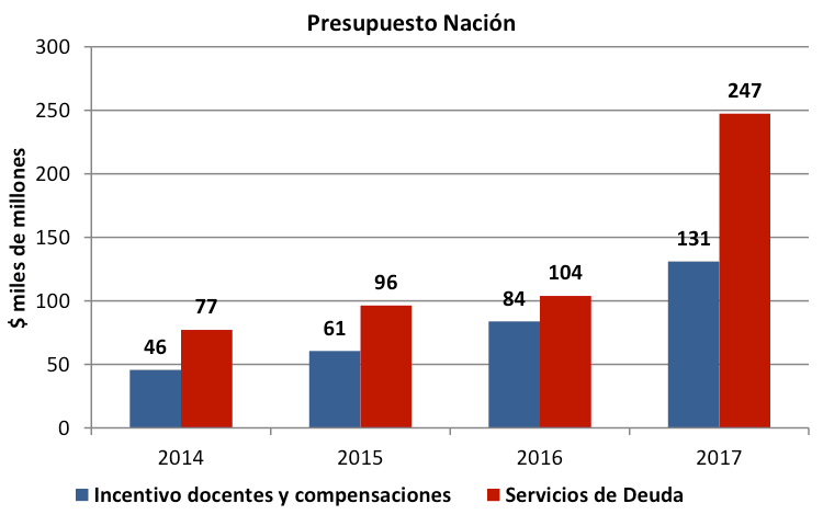 Mientras que las remuneraciones pasaron de 45 mil millones a 109 mil millones, o sea tuvieron solo un incremento del 141 %. Lo cual hizo que la participación en el presupuesto pasara del 25 % o cuarta parte en el 2014, para caer al 24 % en el 2015 – 2016. Y derrumbarse al 21 % para el 2017, pasando así a ser solo una quinta parte del mismo.