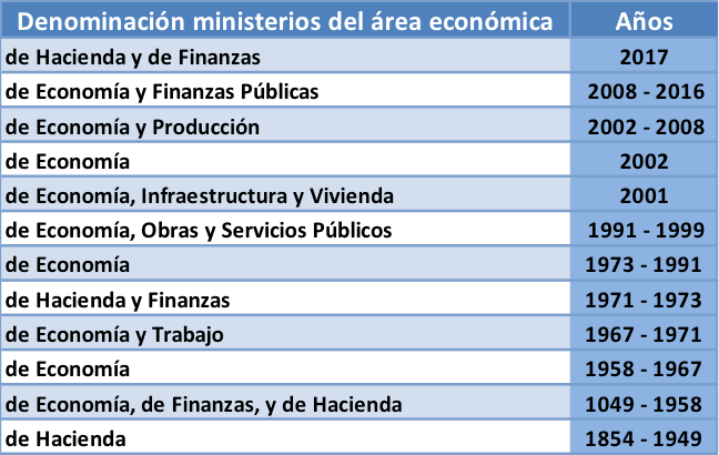 Pero ya hace 68 años que su predominancia se amenguó, con el agregado de las carteras de Economía y Finanzas como ministerios paralelos. Y luego hace ya 59 años, desaparecieron las carteras de Hacienda y Finanzas, que pasaron a ser secretarías. Para solo volver a revivir durante tres años en la penúltima dictadura militar que rigió en el país entre 1966 y 1973, como se puede apreciar en la tabla adjunta. Estableciendo esto un curioso paralelismo con Cambiemos, el actual partido gobernante, que también podría llamarse Retrocedemos.