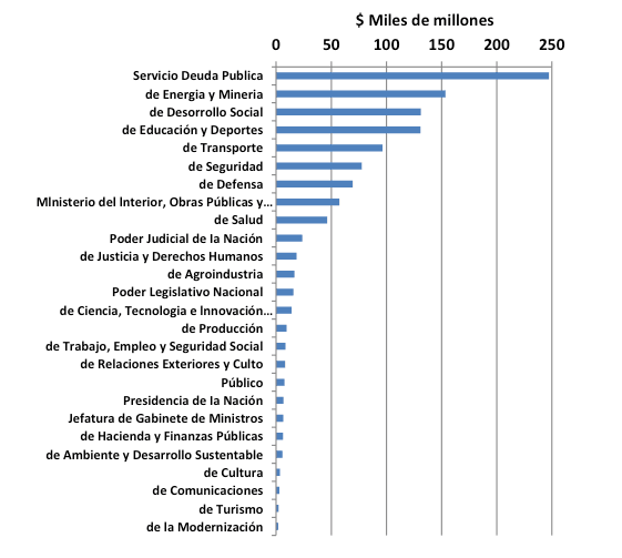 Claramente encabeza el ranking con 250 mil millones el Servicio de la Deuda. Cien mil millones más atrás, viene el ministerio de Energía y Minería, cuyos dineros van a parar a los sectores más concentrados de la economía, con su insaciable codicia de aumentar su tasa de ganancia. A los que el Gobierno, a la par de procurar sacarle una tajada a los salarios docentes, sin hacer auditoría alguna, los acaba de beneficiar hasta el año 2021 con un subsidio para equiparar el precio que reciben por la explotación del gas no convencional, con el gas natural licuado (GNL) importado, que tiene enormes costos de transporte con los buques metaneros (Resolución 46-E/2017).