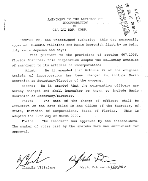 La firma más antigua es el GIA DAL MAR CORP., que estaba a nombre de Claudia Villafañe, la ex esposa del Diego. El nombre es un acrónimo de Giannina y Dalma, las dos hijas de Maradona, creada en el año 1999, que también figurarán como accionistas en otras empresas. Curiosamente, la empresa fue dada de baja un año después. También figura como secretario y director Mario Dobronich, yerno de Guillermo Coppola, ex representante del Diego, hoy enemistados. Tres años antes del nacimiento de esta empresa, a Dobronich se le inició una causa penal por tráfico de autos.
