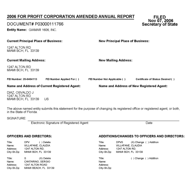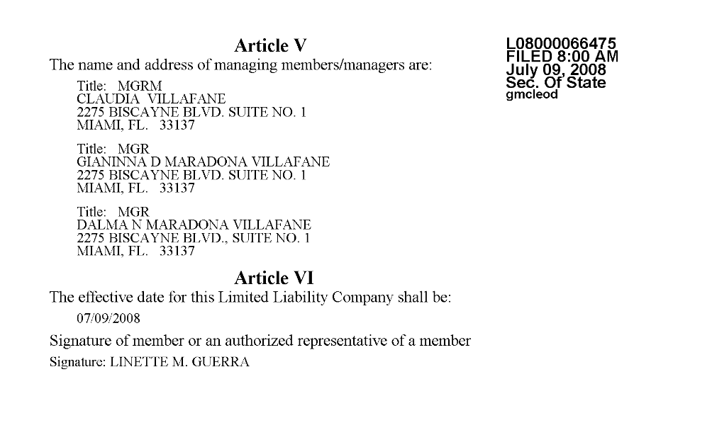Otra empresa donde la familia Maradona-Villafañe figura como accionistas es GIAMAR 1606 INC., del año 2003, donde aparece solo Claudia -en los momentos en donde el divorcio con el astro del fútbol estaba en trámite- y que fue dada de baja tres años después.
