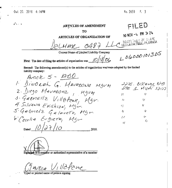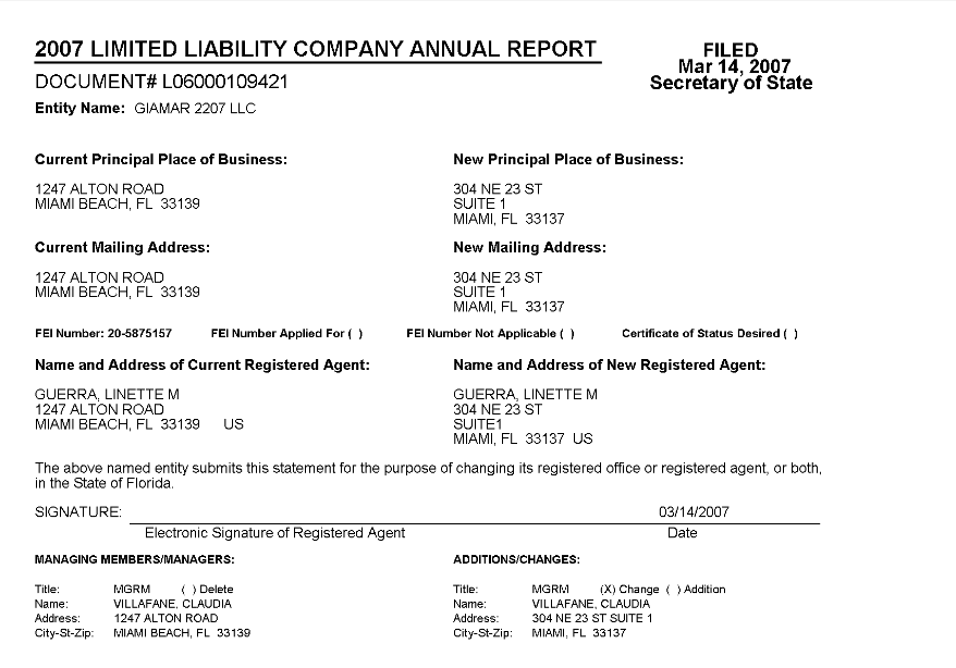 Un mes después, el 10 de noviembre de ese año, Claudia Villafañe puso en actividad una nueva sociedad con el nombre de GIAMAR 2207 LLC., en alusión de Giannina. Sin embargo, se puso en desactividad a los tres días, el 13 de noviembre de 2006. Aunque hasta el año 2015, la compañía continuó con el envío de los reportes anuales al Departamento del Registro Público de Florida.