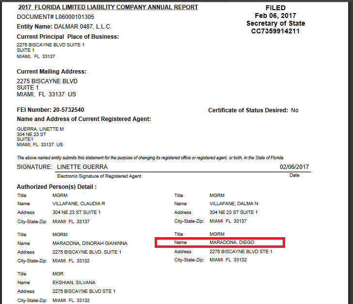 El 18 de octubre de 2006, nacería DALMAR 0487 LLC., donde en este caso El Diego figura como accionista. Allí lo comparte no solo con Claudia, sino también con su hija Dalma Maradona, que de hecho el nombre de la empresa es su apócrifo. Todavía está en actividad. En ese entonces, se encontraba en exposición pública la inversión de crear el complejo habitacional en Miami.
