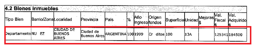 - Un departamento en el barrio de Núñez, de 100 metros cuadrado, adquirido en el año 1999, tasado por la risible suma de 184.500 pesos.