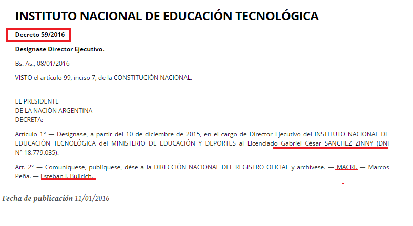 Al poco tiempo de asumir, Bullrich, otra vez lo primero que hizo fue nombrar a sus socios de la off shore “Formar Fundation INC”, que se había olvidado de incluir en su declaración jurada, como funcionarios ahora del gobierno nacional. Hugo Martini pasó a ser su asesor personal. Mientras que el empresario en plataformas Sánchez Zinny, máster en Política Pública en la Universidad de Georgetown, consultor educativo, dueño de la polémica Kuepa, socio a su vez de Rodríguez Larreta, mediante el decreto 59/2016 firmado por Macri y Bullrich el 1 agosto del 2016, pasó a desempeñarse como director del INET.