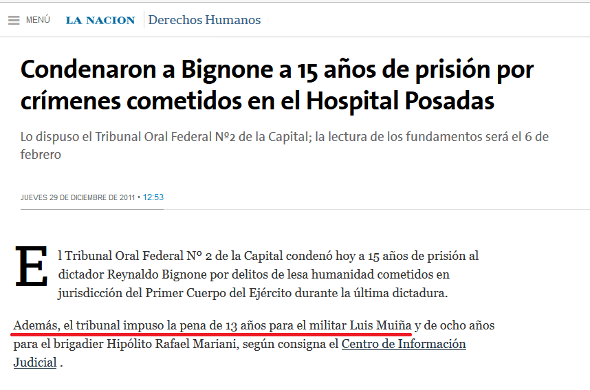 Que había propulsado las dilaciones intencionales en los juicios, que ahora se ven notablemente agravadas con el fallo de la Corte, por la índole de los delitos, y la gran duración que tuvieron los juicios de lesa humanidad, por la nula colaboración y sucesivas apelaciones interpuestas por quienes resultaron condenados en ellos, como fue el caso Muiña.