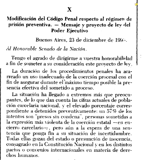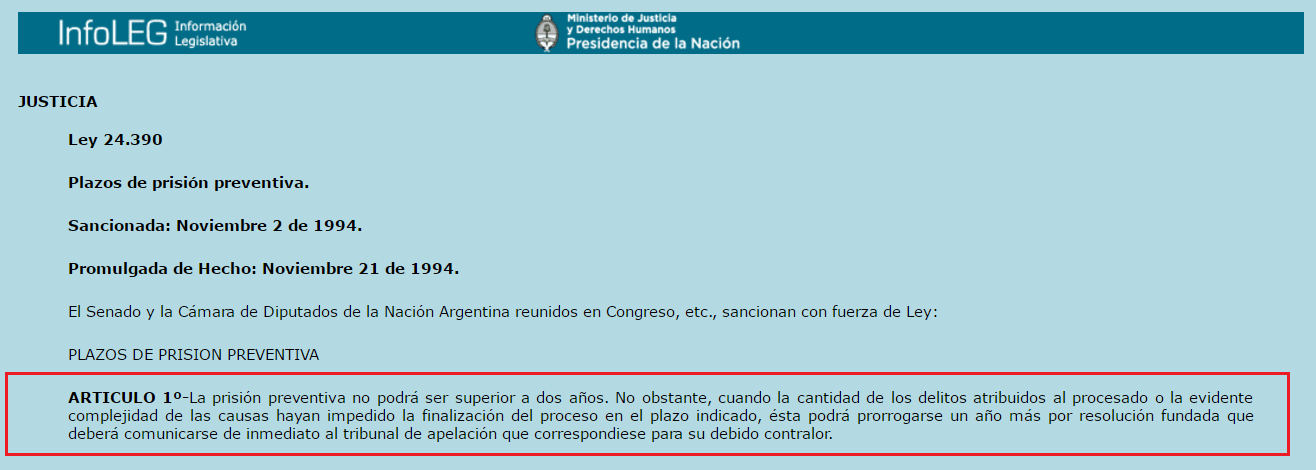 “Por esta ley se incorporó un nuevo sistema de cómputo de la pena a partir del cumplimiento de los dos años de detención sin sentencia. Se sancionó en una época de transición entre el procedimiento escrito y el oral en el Código Procesal Penal de la Nación… El proyecto establece plazos y fija las condiciones para que proceda el cese de la prisión preventiva y, al incorporar la ley 24.390 al Código Procesal Penal de la Nación, supera el debate acerca de la constitucionalidad de normas procesales que deberían ser aplicadas por las provincias.”