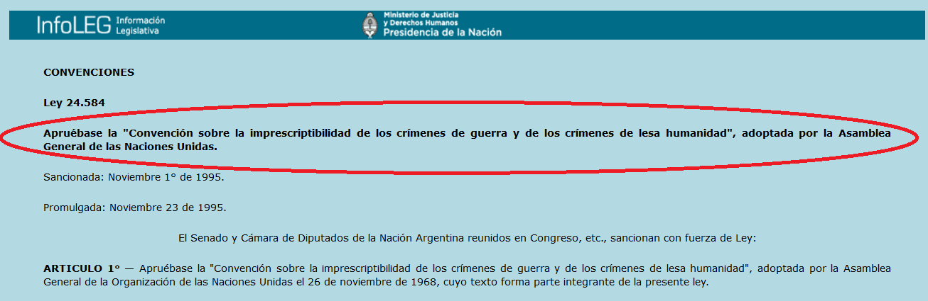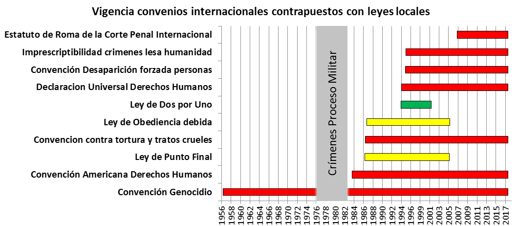 Tales como la Convención para la prevención y sanción de Genocidios, vigente desde el 25/04/1956, aunque los delitos de lesa humanidad perpetrados durante la dictadura militar, técnicamente no son un genocidio, aunque se lo denomina como tal. La Declaración Universal de Derechos Humanos, vigente desde 15/12/1994. La Convención Americana Derechos Humanos, vigente desde 27/03/1984. La Convención contra la tortura y otros tratos crueles, vigente desde el 26/02/1987. La Convención por la Desaparición forzada de personas, vigente desde el 18/10/1995. La elevación a rango constitucional la Declaración de Imprescriptibilidad de los Crímenes de Lesa Humanidad, vigente desde el 13/08/2003, al mismo tiempo que se derogaron las leyes de Obediencia Debida y Punto Final. Y la adhesión al Estatuto de Roma de la Corte Penal Internacional, vigente desde el 9/01/2007.