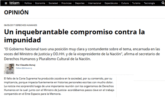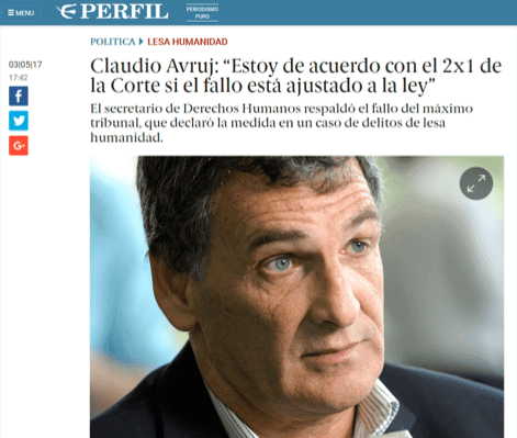 Apenas fue noticia, el secretario de Derechos Humanos Claudio Avruj, consultado por la AM 750, fue el primer funcionario de Macri que hizo una declaración pública al respecto, a favor del mismo: “Estoy de acuerdo con el 2×1 de la Corte si el fallo está ajustado a la ley. Hay que ser respetuosos del fallo de la Corte al respecto. Por sobre todos nosotros está el marco regulatorio de la ley«.