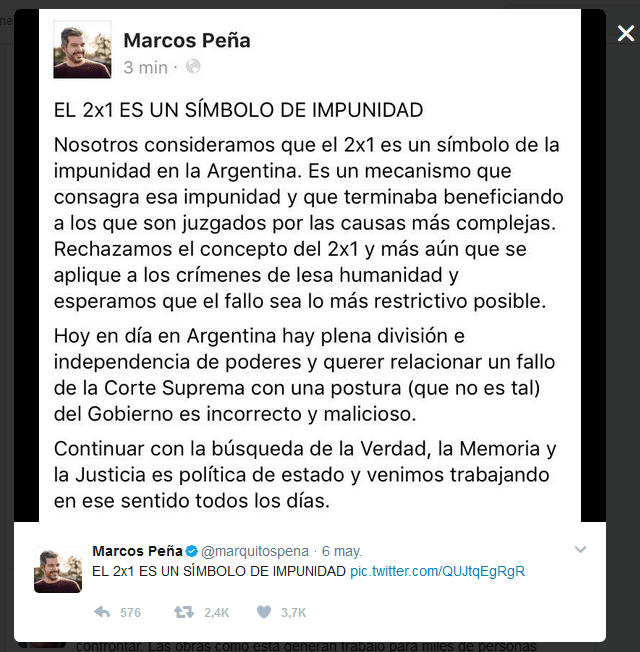 El 6 de mayo, cuando Avruj comenzó a matizar su postura, el jefe de gabinete Marcos Peña, hijo de un alto funcionario de la dictadura militar, declaró en las redes sociales que el fallo “es un símbolo de impunidad… Rechazamos el concepto del 2×1 y más aún que se aplique a los crímenes de lesa humanidad y esperamos que el fallo sea lo más restrictivo posible”, negando que tuviera algo que ver con el gobierno.