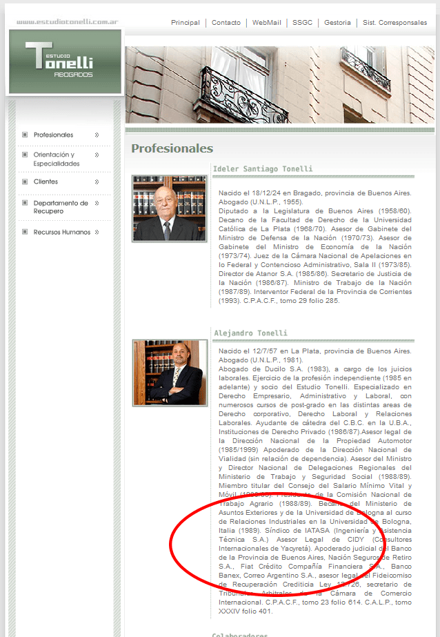 La mención de Tonelli no es gratuita, dado que en esos manejos estuvo involucrado el influyente estudio Tonelli, que hasta hoy tiene como cliente a Correo Argentino. Creado por el mencionado Ideler Tonelli, un borocotó de la política, que fue diputado nacional durante el gobierno de Frondizi. Asesor del gobierno de la Revolución Argentina. Asesor del gobierno de Perón e Isabel. Juez durante el Proceso Militar, jurando por el estatuto de este. Y secretario de Justicia durante el gobierno de Alfonsín, autor de las anuladas leyes de obediencia debida y punto final, que impidieron durante un tiempo el juzgamiento de los crímenes de lesa humanidad.