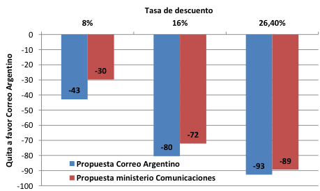 Además si se profundiza la cuestión, haciendo el cálculo a valor actual a junio de 2016, de la propuesta de Correo Argentino y la contrapropuesta de Mocoroa, la mejora obtenida por el Estado se revela insignificante. Ya que calculándola con la tasa de intereses del 16 % anual, que es la que brinda el Estado en sus títulos públicos en pesos a mediano plazo, la quita del valor actual, sin considerar la enorme pérdida desde el 2001 hasta esa fecha, habría bajado solo del -80 % al -72 %, o sea solo 8 puntos.