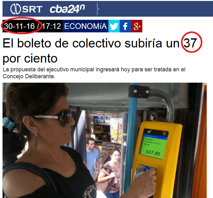 Seis meses después, y dentro de ese mismo año, la profecía de la agencia de noticias del gobierno de Macri no se cumplió. Ya que el Concejo Deliberante de la ciudad de Córdoba aprobó el aumento del boleto, que pasó de los 9,15 pesos al precio que rige actualmente, 12,55 pesos. Como si fuera un chiste de pésimo gusto, ese incremento rondó en el 37%, el mismo incremento que se le dio a las empresas concesionarias que manejan los colectivos de Córdoba, en especial a ERSA.