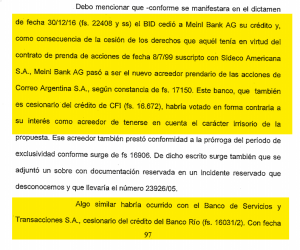 Ello fue posible, conforme detalla Boquín en su dictamen, porque tanto el BID como el CFI le cedieron sus acreencias al Meinl Bank AG. Y a ello se sumó la cesión que hicieron los Banco Rio y Galicia a favor del BST (Banco de Servicios y Transacciones). Y la explicación de estas inusitadas cesiones de créditos, a cobrar con una quita del orden del 99 % según la propuesta concretada por el grupo Macri, que representa una virtual condonación de deuda, resulta ser horrible para la Republica, conforme lo insinúa la fiscal Boquín en la página 97 de su dictamen.