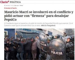 A las nueve y media de la noche de ese mismo día, cuando la represión en PepsiCo fue el gran tema central de la jornada, con todos los canales de televisión transmitiendo los momentos más álgidos de los incidentes, y testimonios y entrevistas tanto en estudios como en el lugar de los hechos, el portal de Clarín público un artículo donde aseguró que el presidente Macri no solo se involucró en el desalojo, sino que insistió en que se debía llevar a cabo, y con “firmeza”.