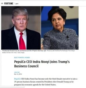 Según un archivo de diciembre de 2016 de esa misma publicación: “Añadir a Nooyi al equipo de expertos en negocios de Trump da un asiento en la mesa a una voz clave que puede abogar y asesorar en nombre de la industria de alimentos y bebidas, que no tenía representantes en el consejo hasta entonces. Sus ideas en el mundo alimenticio probablemente serán útiles en la relación con la Administración Nacional de Alimentos y Medicamentos de Estados Unidos, así como las políticas que involucran el comercio, impuestos y directrices nutricionales, ya que muchas grandes empresas de alimentos venden miles de millones de bienes en el extranjero”.