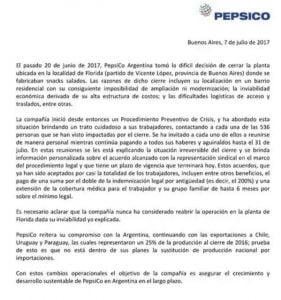 El 20 de junio de este año fue la fecha en que PepsiCo Alimentos informó el cierre de su planta ubicada al norte del Conurbano. Sus trabajadores se enteraron por una fotocopia pegada en la entrada del establecimiento. En el papel, se especificó el cese de las operaciones en el barrio, y que se iba a llevar a cabo una relocalización sin decir donde. Además, se dio un número de teléfono para todo aquel empleado que requería información al respecto.