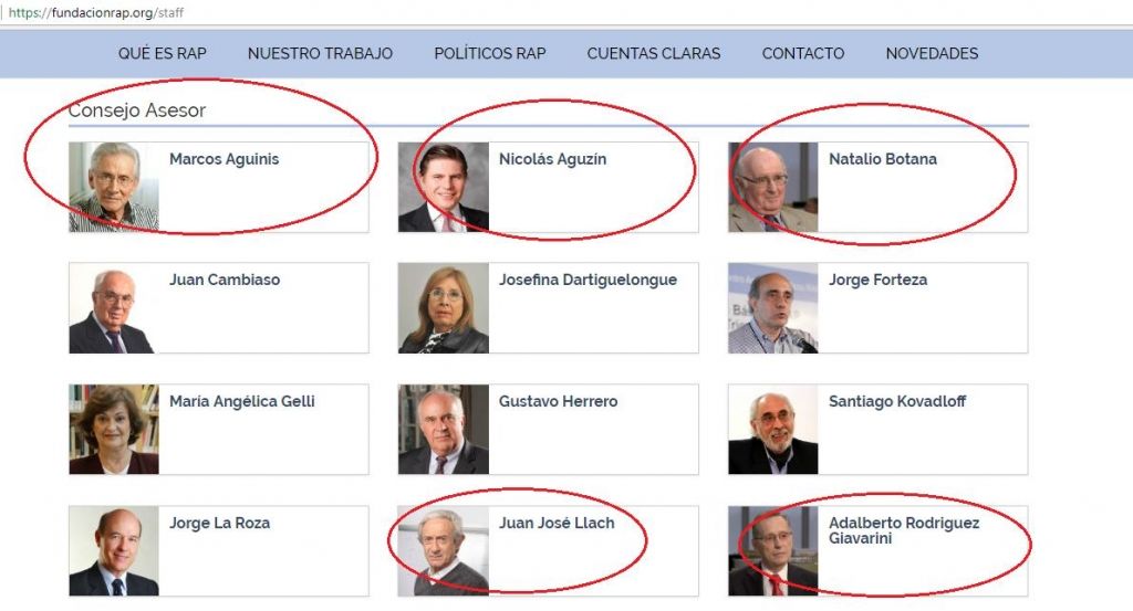 Otro de los asesores es Nicolás Aguzín, ex presidente ejecutivo de JP Morgan América latina, la financiera norteamericana con claros intereses comerciales en los títulos de deuda pública argentina. También asesora a la RAP, el politólogo argentino Natalio Botana, sobrino del ex director del extinto diario Crítica, Natalio Félix Botana, quién a su vez pregonó a través de ese medio impreso una clara orientación antiperonista. El politólogo Botana es docente hoy de la Universidad Torcuato Di Tella, casa de estudios dónde se formaron varios miembros del gabinete de Mauricio Macri. También proveniente de la Di Tella, es asesor de RAP, el abogado Juan Cambiaso, quién es Presidente del Consejo de Desarrollo de la Escuela de Derecho de la mencionada universidad.