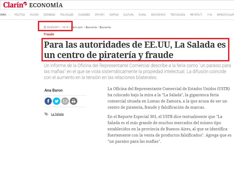 Ese día la Oficina del Representante de Comercio de los Estados Unidos “responsable de desarrollar, coordinar y supervisar la política comercial internacional”, publicó el “Informe Especial 301 sobre Derechos de Propiedad Intelectual” donde denunciaba a La Salada, como “uno de los mayores mercados al aire libre de América Latina que ofrece a la venta grandes cantidades de mercancías falsificadas y pirateadas”.
