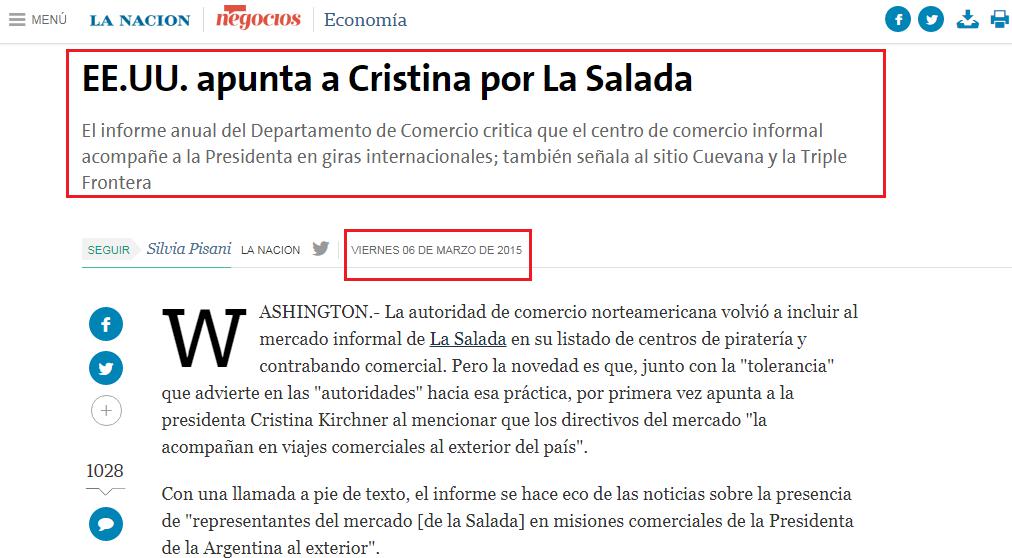 Nuevamente, los principales medios de Argentina, fueron un eco fiel esta denuncia del gobierno de Estados Unidos. Uno de ellos, el diario La Nación, quien publicó una nota titulada: “EE.UU. apunta a Cristina por La Salada”.