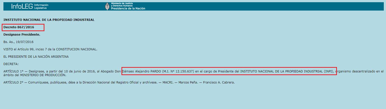 Como primera medida, el 19 julio del 2015, mediante el decreto 867/16, el presidente Macri nombró al abogado “Don” Dámaso Alejandro Pardo como presidente del Instituto Nacional de Propiedad Industrial (INPI) en remplazo de Mario Aramburu, que hacía 15 años ocupaba ese cargo.