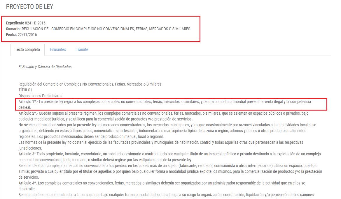 Se registró bajo el expediente 8241-D-2016. Se titula “Regulación del Comercio en complejos no convencionales, ferias, mercados o similares”. Y un somero repaso por sus principales artículos lo muestra como un proyecto claramente anti-saladas, que parece escrito por algún trasnochado representante de la Oficina de Comercio de los Estados Unidos.