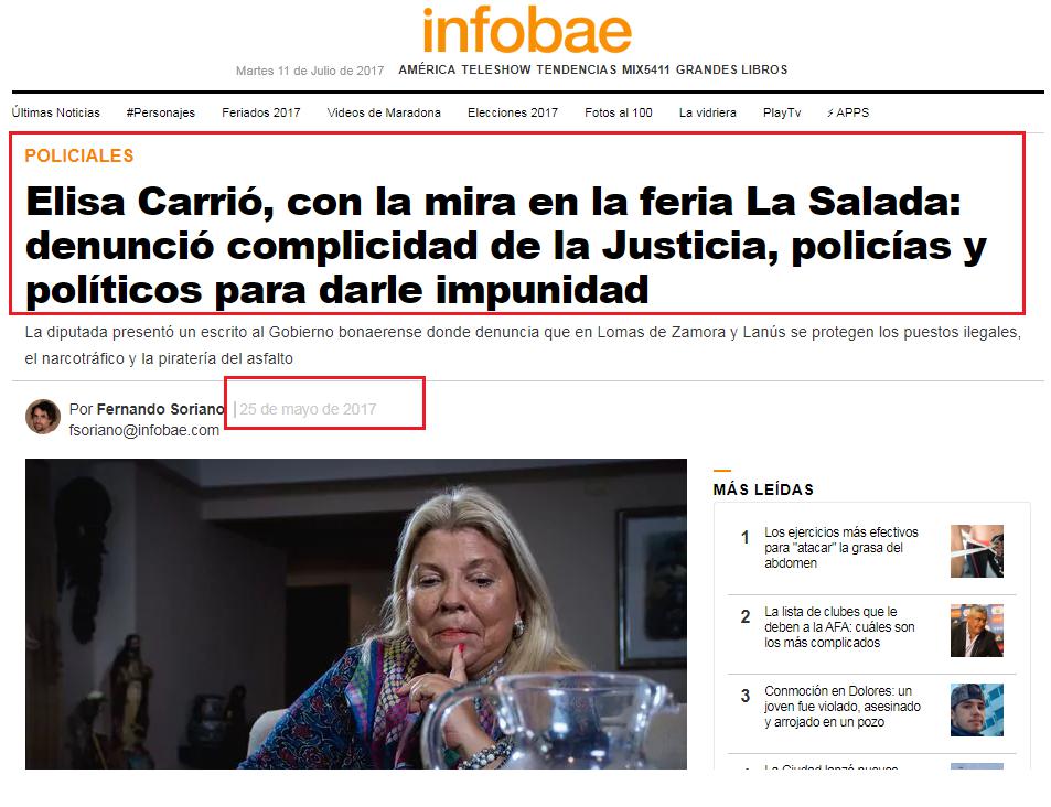 El 22 de mayo, la poderosa diputada de Cambiemos Elisa Carrió, “Ministra de ética” del gobierno nacional, cuyo accionar siempre se mueve en consonancia con los intereses norteamericanos, presentó una denuncia ante el vicegobernador de la provincia de Buenos Aires, Daniel Salvador, y el procurador general Julio Conte Grand en contra de la Salada y su titular Jorge Castillo.