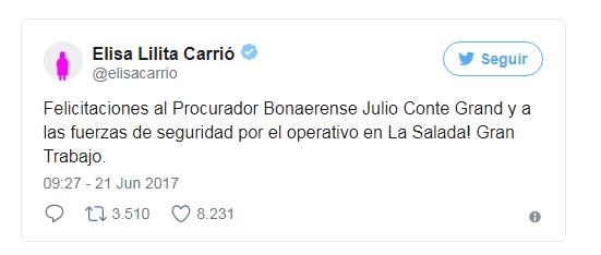 Por su parte, Carrió, desde su cuenta de Twitter, felicitaba al Procurador general de la provincia y a las fuerzas de seguridad, por el operativo.