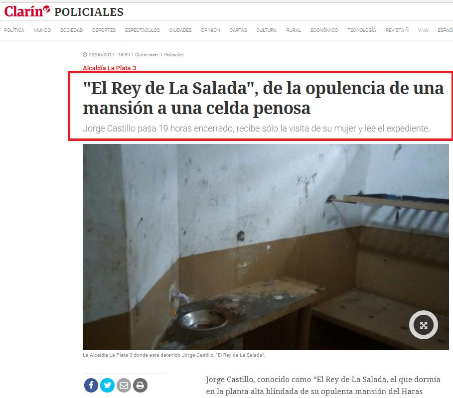Tras su mediática detención, como si fuese un show para el exterior, Castillo, fue recluído en una precaria celda despintada y fría en la Alcaldía 3 La Plata. Paradoja que fue destacada, casi con sarcasmo, por algunos medios, como Clarín, cuyo dueño Héctor Magnetto es habitué de la embajada de Estados Unidos, que publicó una adjetivada nota titulada “El rey de la Salada, de la opulencia de una mansión, a una celda penosa”.