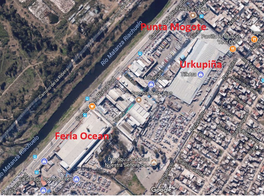 El predio tiene 20 hectáreas. Y se compone por tres grandes galpones, como se puede ver en la imagen de abajo, que funcionan con nombres diferentes: Urkupiña, Punta Mogotes y Ocean.