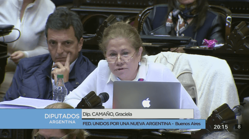 Finalmente, en su última intervención, previa a la votación, Camaño volvió a endurecerse contra el proyecto de ley, a pesar que seguidamente su voto fue positivo. A su lado, estaba el líder de su frente, Sergio Massa, con ropa informal y mirada muy atenta y acechante, en momentos posteriores a que Pérez dio a entender que su voto por la “Ley Calcaterra” sería negativo.