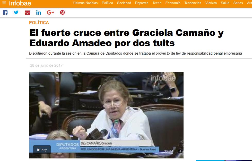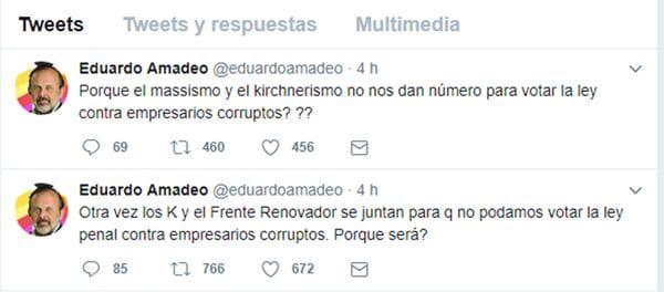 La provocó el diputado del PRO, Eduardo Amadeo, quien mientras Camaño realizada su discurso para dar tiempo a que sus pares entraran a la Cámara, publicó en su cuenta de Twitter dos mensajes: “¿Por qué el massismo y el kirchnerismo no nos dan número para votar la ley contra empresarios corruptos?”. “Otra vez los K y el Frente Renovador se juntan para que no podamos votar la ley penal contra empresarios corruptos. ¿Por qué será?”.