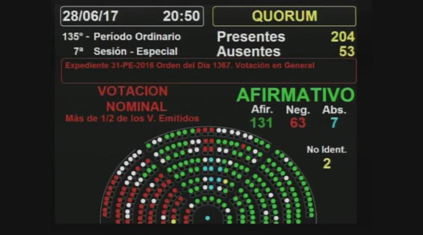 Alrededor de las nueve de la noche, y después del rechazo a la moción de que el proyecto volviera a discutirse en comisión, se sometió a votación la aprobación en general del proyecto. El resultado fue de 131 votos a favor, 63 en contra, y 7 abstenciones. Con un acalorado aplauso, distintos bloques festejaron con el supuesto avance de la lucha contra la corrupción empresarial.