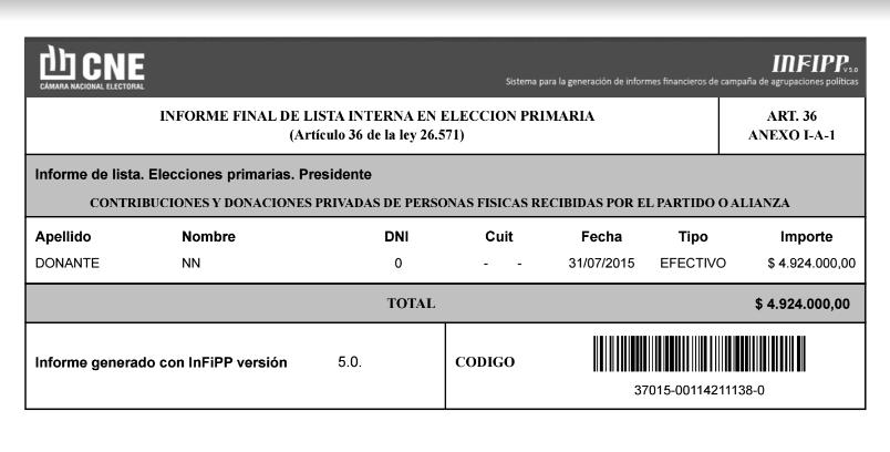 De hecho, De la Sota quedó envuelto en un escándalo después de las elecciones, cuando en su nómina de aportantes apareció un “N.N.” como el responsable de entregar la mitad de los fondos: 5 millones de pesos. Según el equipo delasotista, en realidad se trató de una generalización, debido a que no le alcanzaron los tiempos para detallar los nombres y los apellidos de quienes dieron sus billetes para la campaña “De la Sota Presidente 2015”.