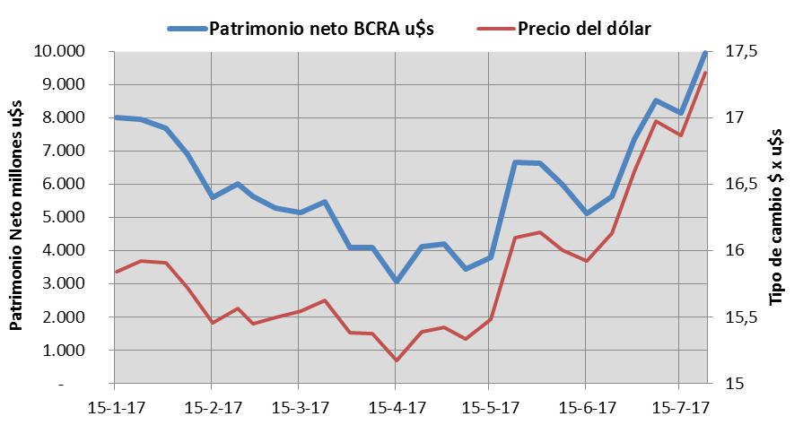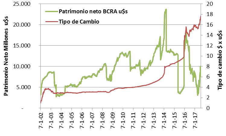 Como corroboración de lo expuesto, el gráfico muestra la notable agudización que se va dando desde el 2002 en adelante, respecto la sensibilidad que manifiesta el Patrimonio Neto del Banco Central (expresado en el gráfico en dólares al tipo de cambio de cada fecha) en relación al valor del dólar. Provocando las sucesivas devaluaciones, que pasaron de $ 1 a fines de diciembre de 2001, a $ 17,7 a fines de julio de 2017, impactos cada vez más notables en el crecimiento del Patrimonio Neto del banco.