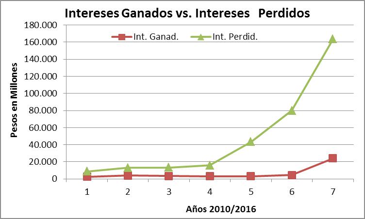 El siguiente gráfico del análisis de Ragonesi, revela el enorme costo creciente que tiene para el Banco Central los intereses perdidos por el pago de las Lebac, que superan largamente los intereses ganados mediante otros instrumentos. Llegando en el ejercicio del 2016 a representar 163 mil millones de pesos perdidos, contra solo 24 mil millones de pesos ganados. O sea una pérdida neta de 139 mil millones de pesos.