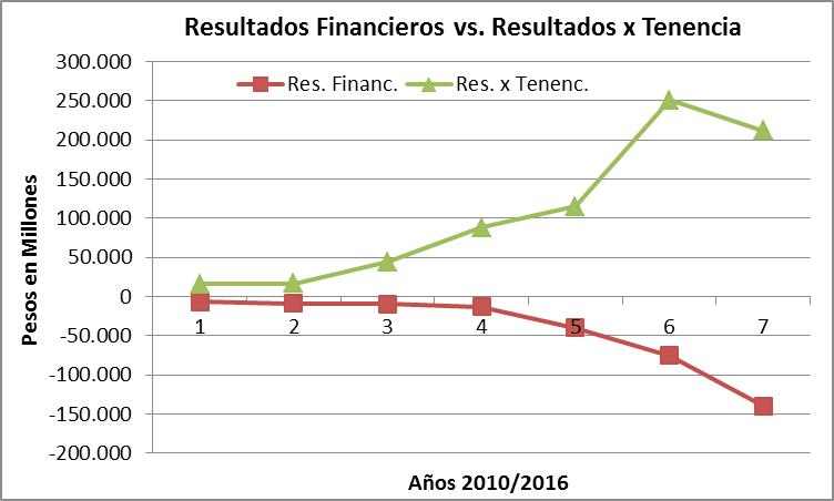 En él se puede ver como los Resultados por Tenencia, superan largamente los Resultados Financieros. Que resultaron cada vez más adversos desde el 2012 en adelante, hasta llegar al 2016, en que la pérdida de los 139 mil millones de pesos de Resultados Financieros, fueron enjugadas con creces con la ganancia de 212 mil millones por los Resultados por Tenencia.